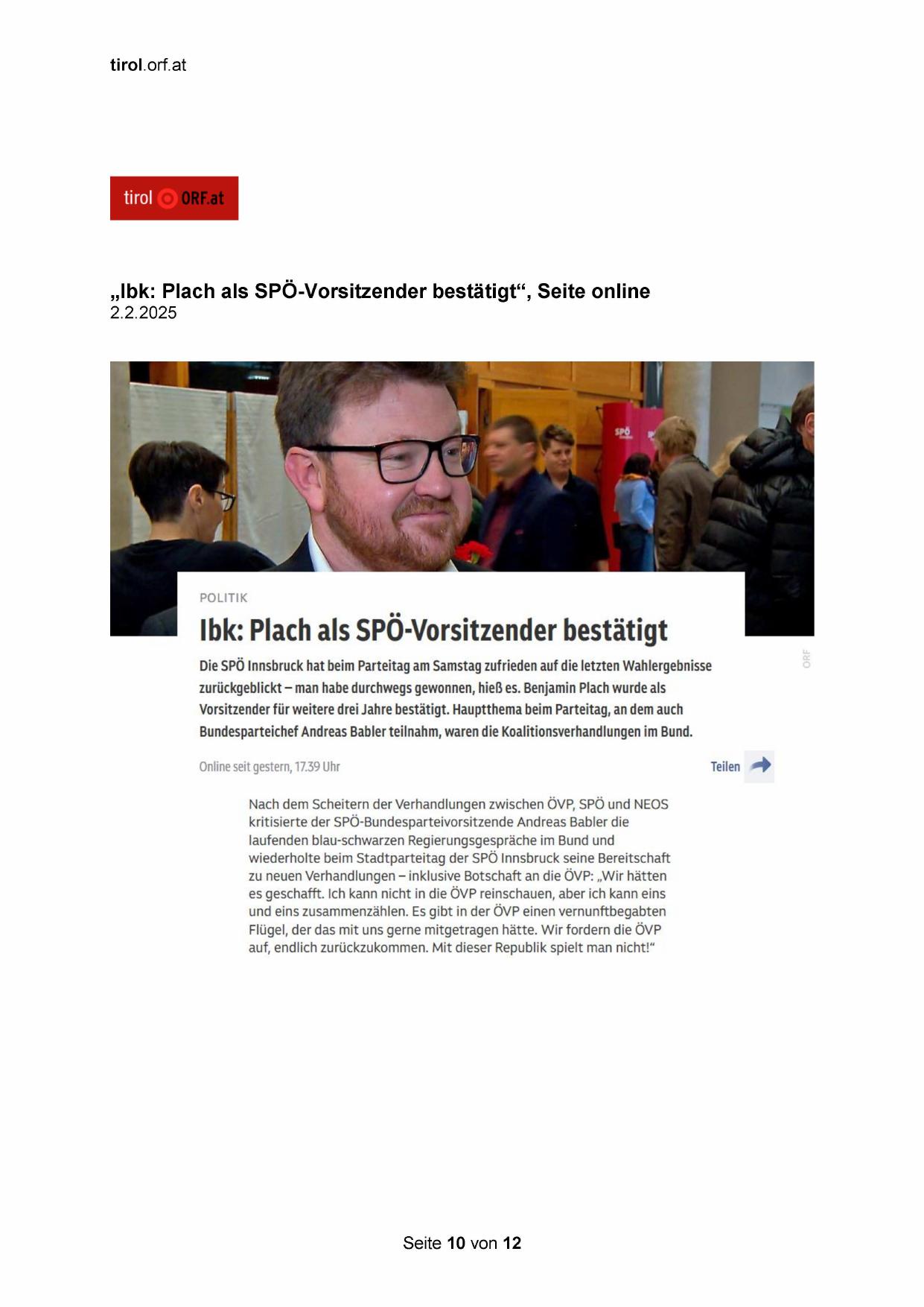„Ibk: Plach als SPÖ-Vorsitzender bestätigt“, Seite online