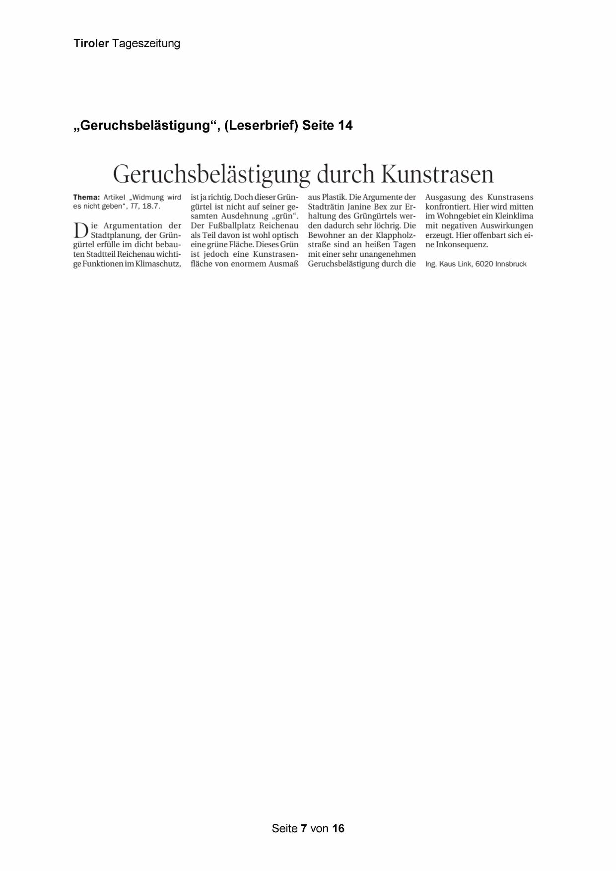 „Geruchsbelästigung“, (Leserbrief) Seite 14