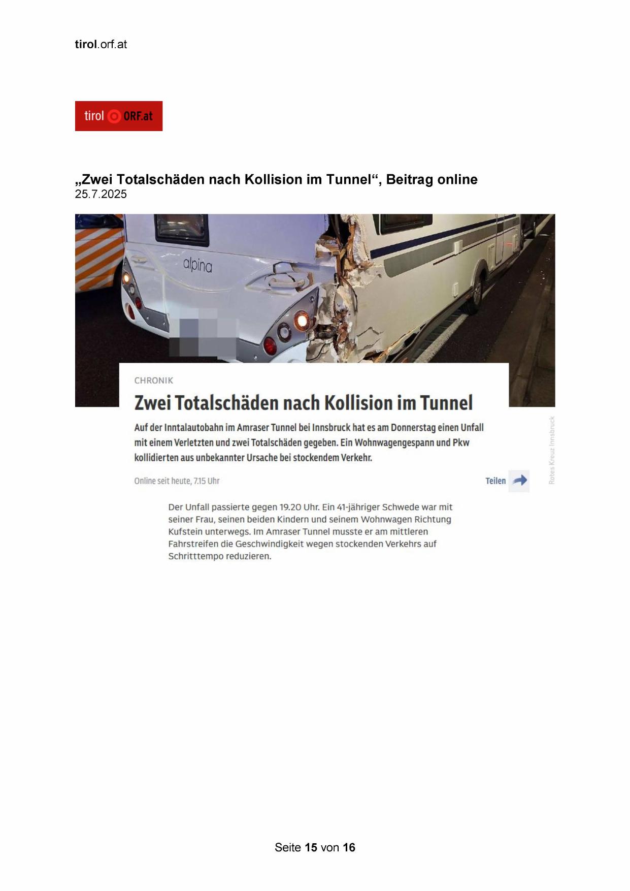 „Zwei Totalschäden nach Kollision im Tunnel“, Beitrag online