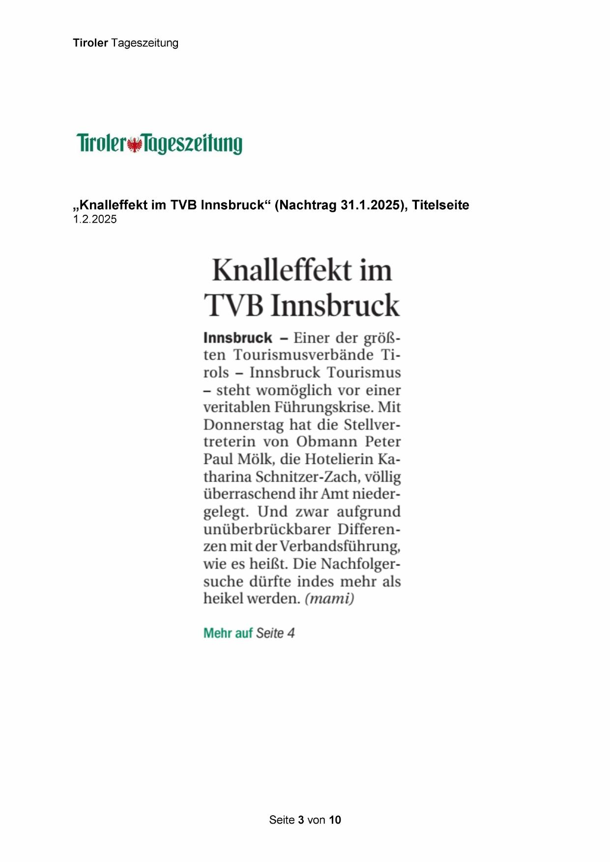 „Knalleffekt im TVB Innsbruck“ (Nachtrag 31.1.2025), Titelseite
