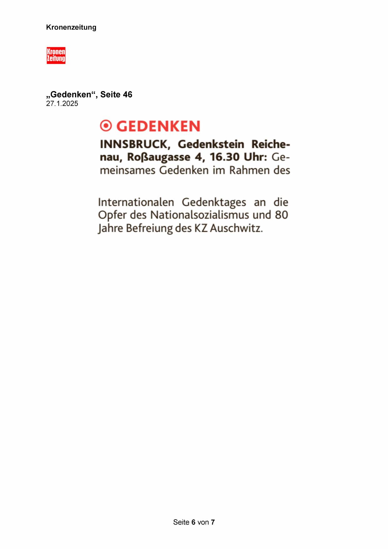 INNSBRUCK, Gedenkstein Reichenau, Roßaugasse 4, 16.30 Uhr: Gemeinsames Gedenken im Rahmen des
