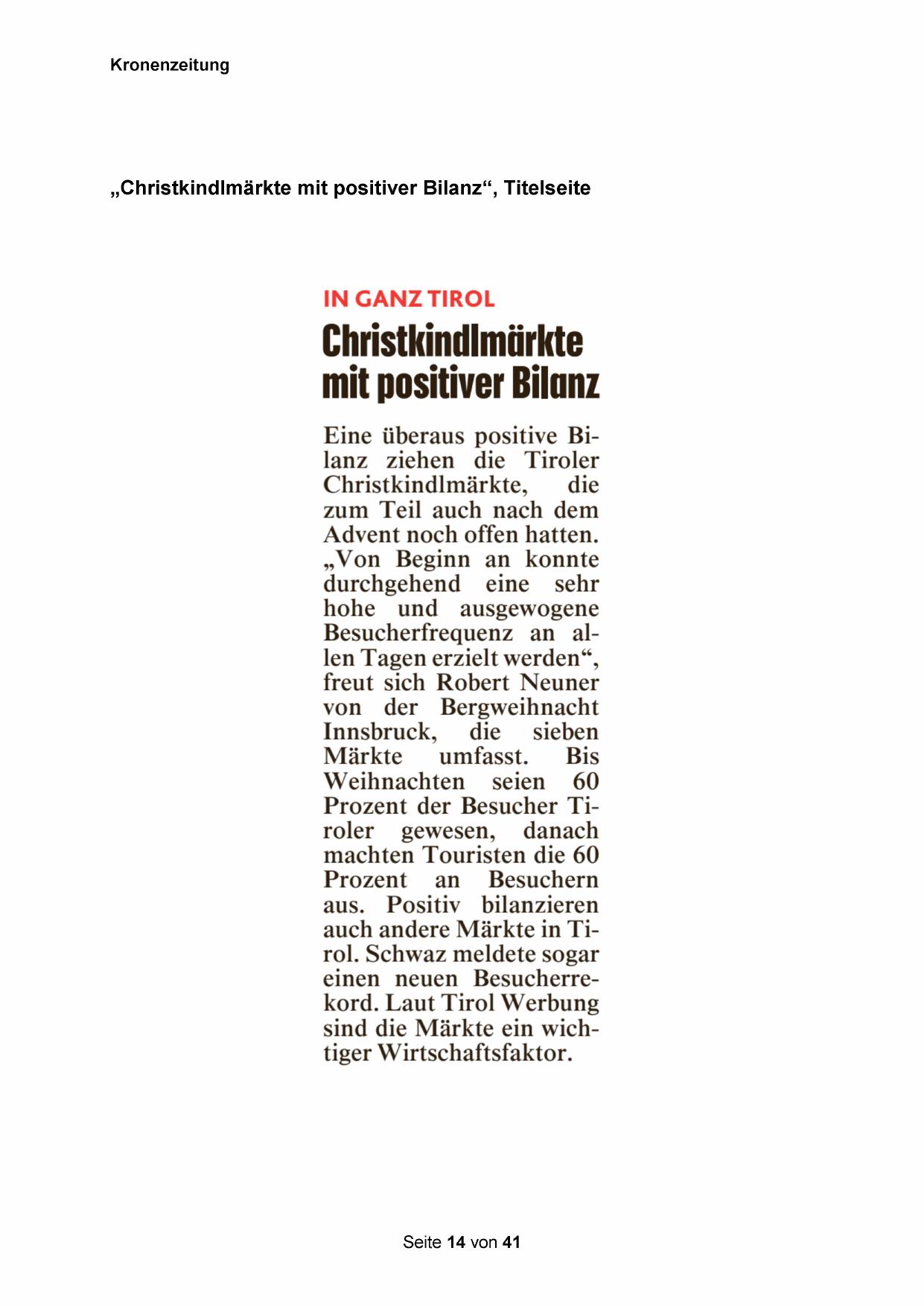 „Christkindlmärkte mit positiver Bilanz“, Titelseite