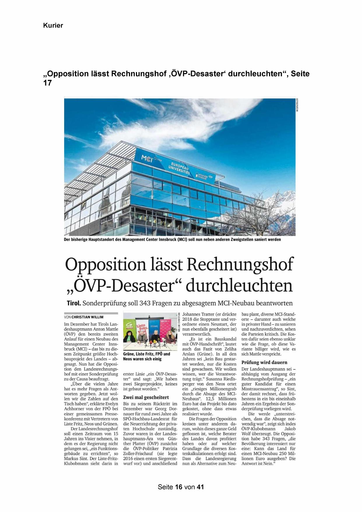 Management Center Innsbruck (MCI) — das bis zu diesem Zeitpunkt größte Hochbauprojekt des Landes — abgesagt. Nun hat die Opposition den Landesrechnungshof mit einer Sonderprüfung