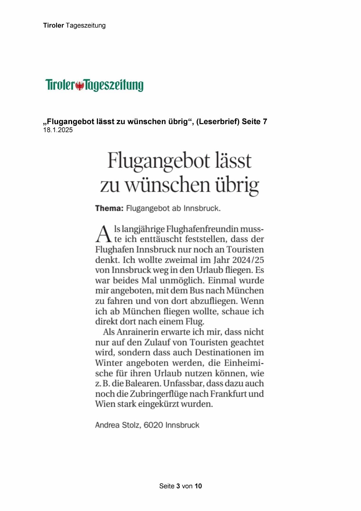 „Flugangebot lässt zu wünschen übrig“, (Leserbrief) Seite 7