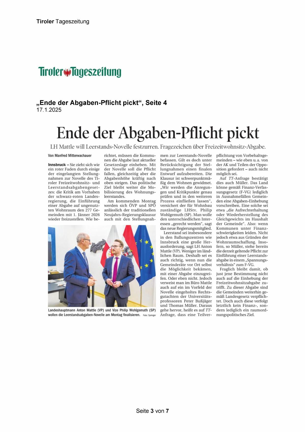 LH Mattle will Leerstands-Novelle festzurren. Fragezeichen über Freizeitwohnsitz-Abgabe.