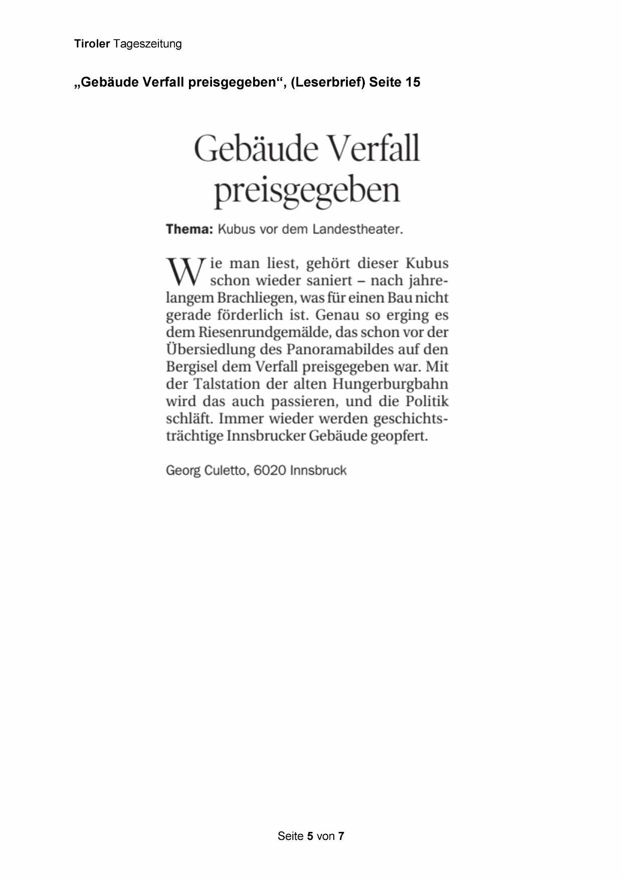 „Gebäude Verfall preisgegeben“, (Leserbrief) Seite 15