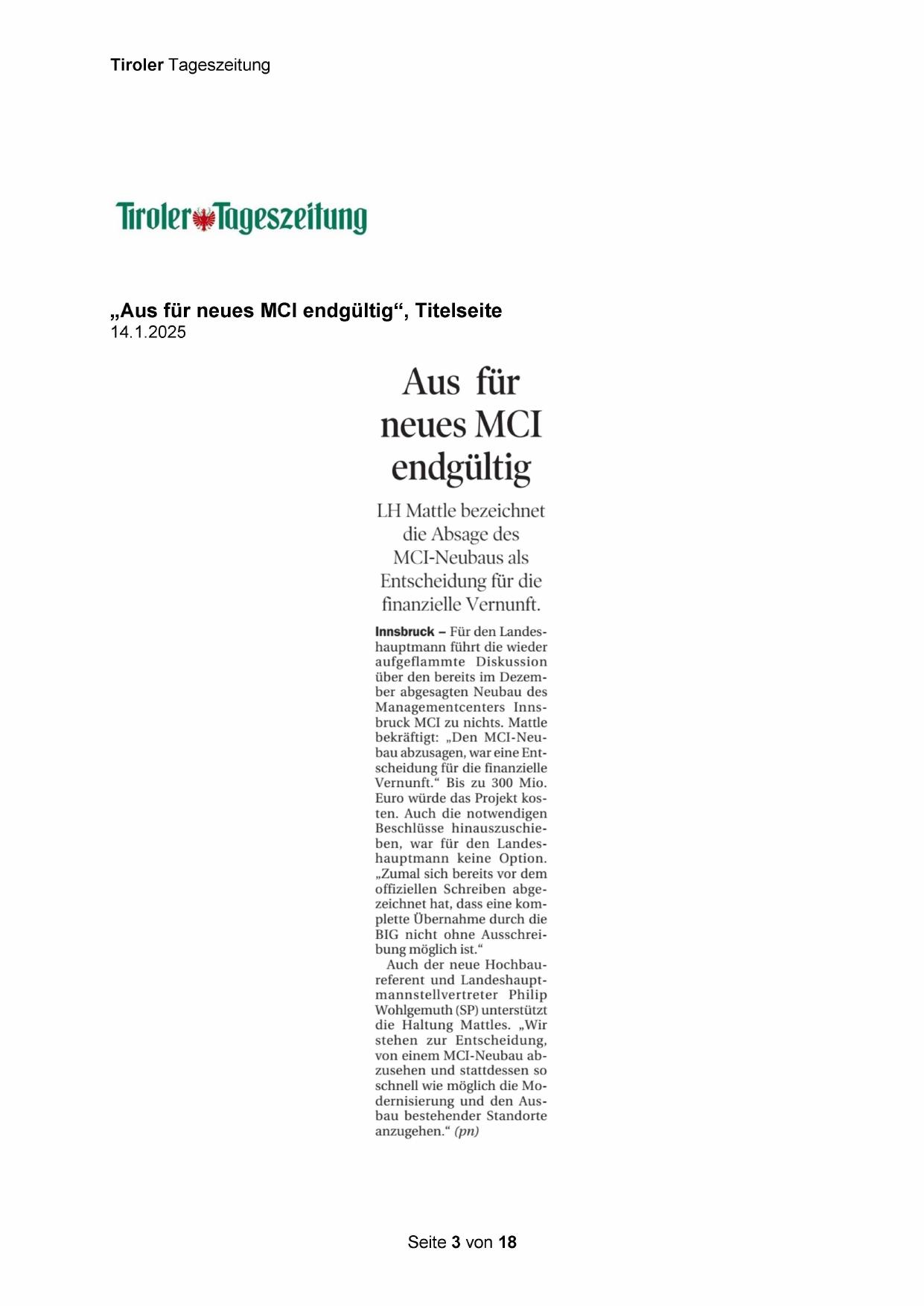 bekräftigt: „Den MCI-Neubau abzusagen, war eine Entscheidung für die finanzielle