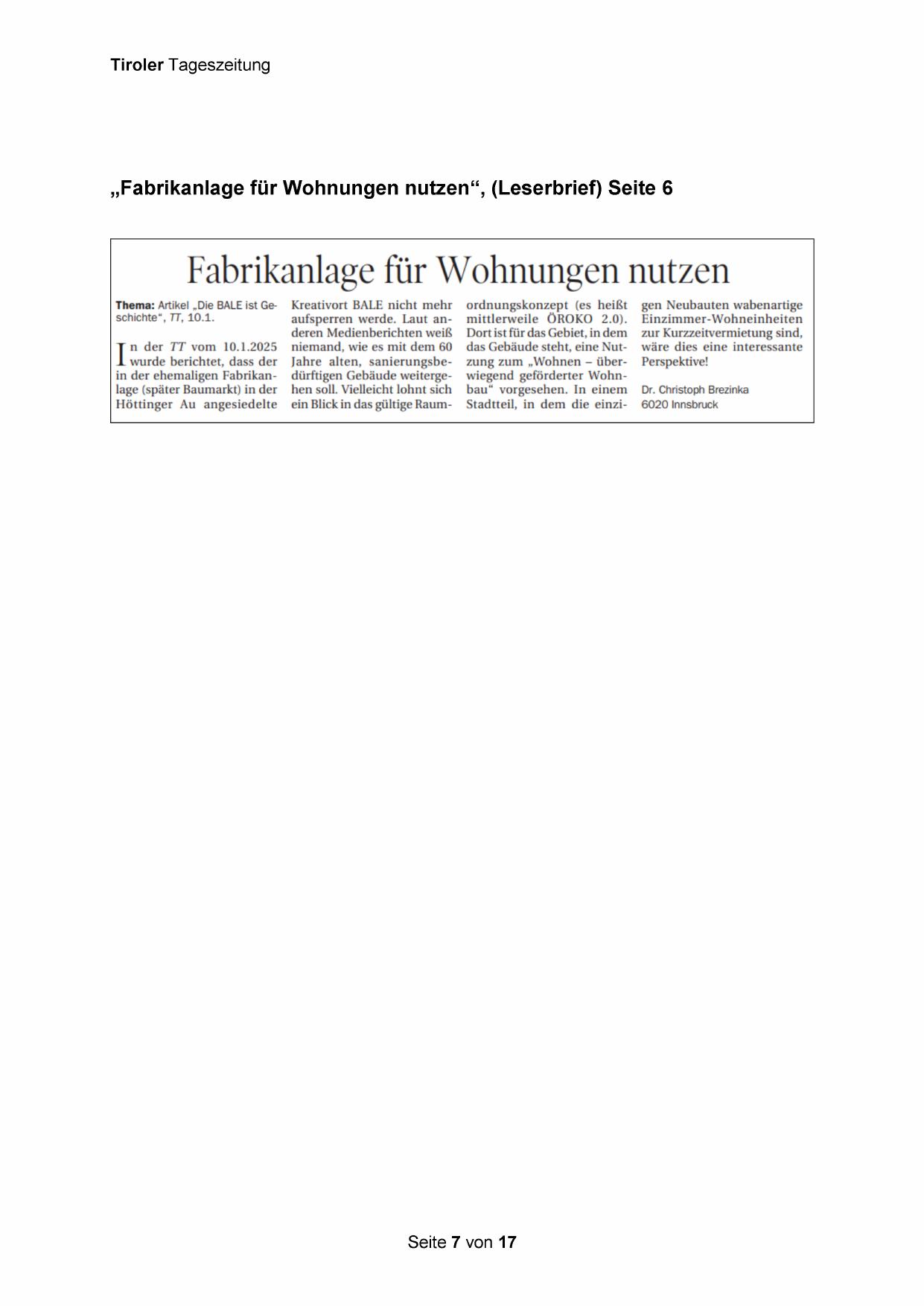 „Fabrikanlage für Wohnungen nutzen“, (Leserbrief) Seite 6
