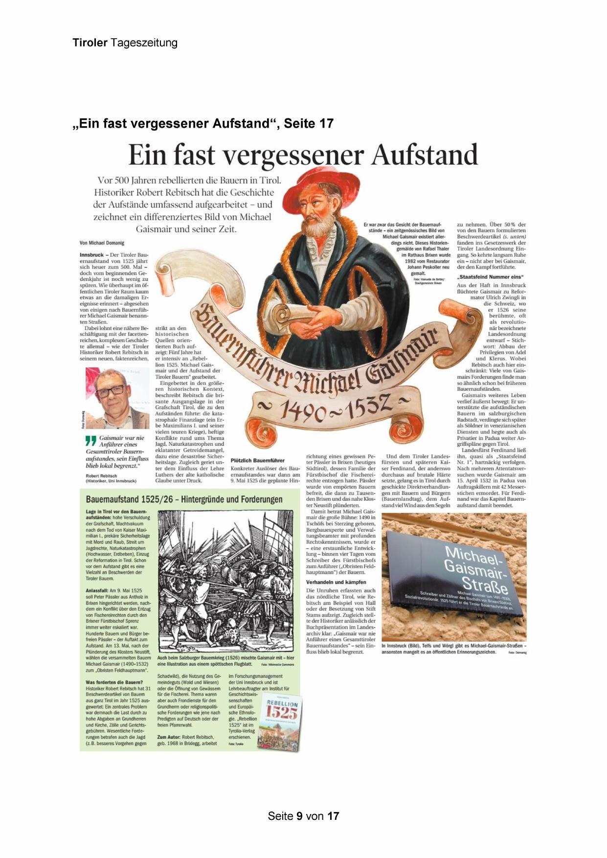 Aufstand. Am 13. Mai, nach der Bauernaufstandes“ — sein Ein- In Innsbruck (Bild), Telfs und Wörgl gibt es Michael-Gaismair-Straßen -