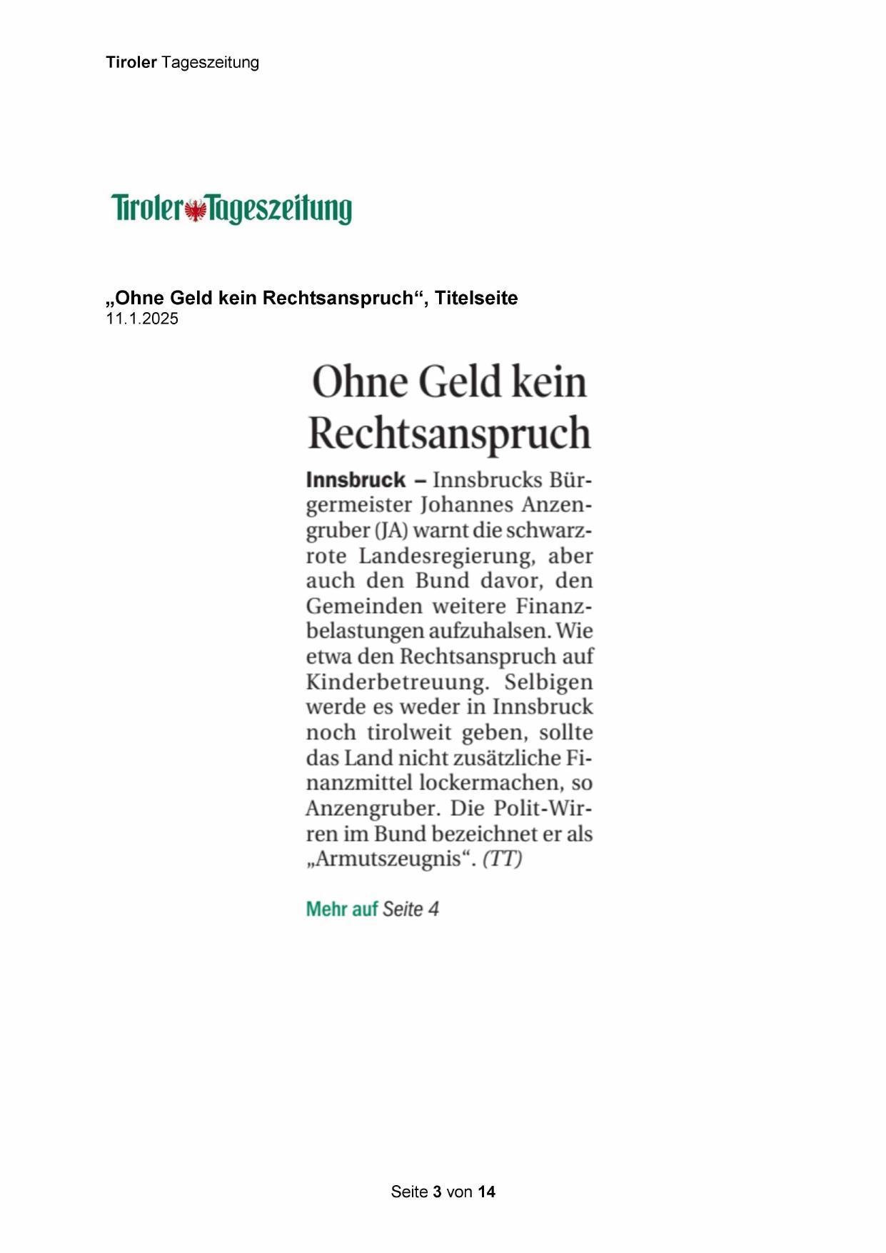Innsbruck —- Innsbrucks Bürgermeister Johannes Anzengruber (JA) warnt die schwarzrote Landesregierung, aber