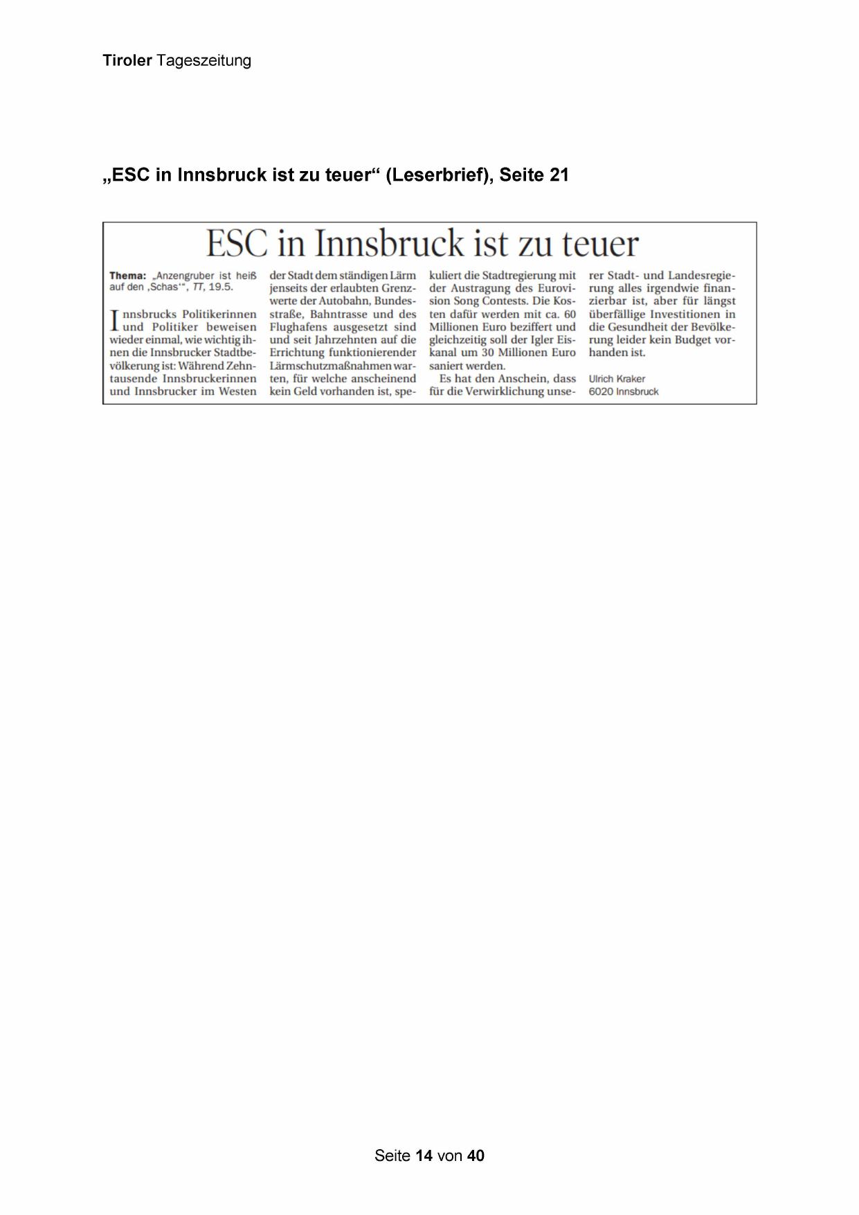 „ESC in Innsbruck ist zu teuer“ (Leserbrief), Seite 21