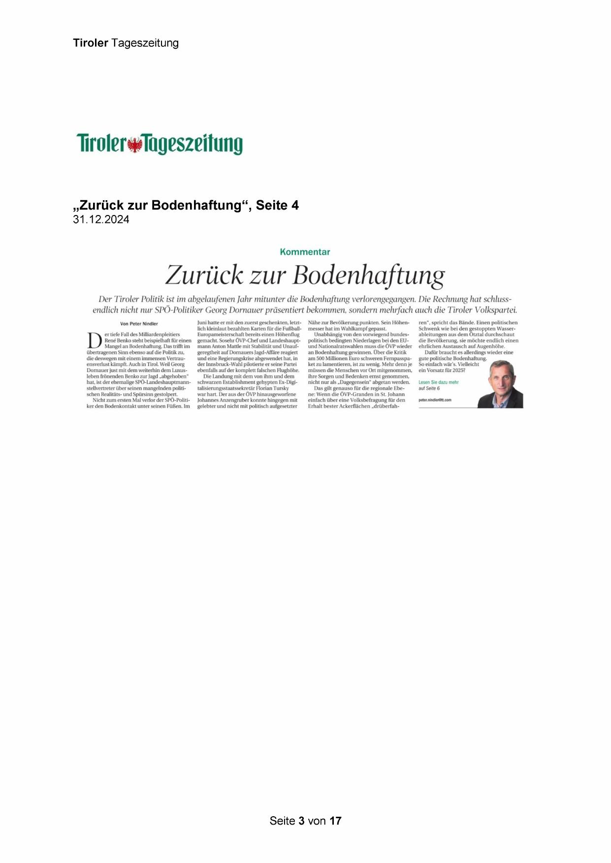 Der Tiroler Politik ist im abgelaufenen Jahr mitunter die Bodenhaftung verlorengegangen. Die Rechnung hat schlussendlich nicht nur SPO-Politiker Georg Dornauer präsentiert bekommen, sondern mehrfach auch die Tiroler Volkspartei.