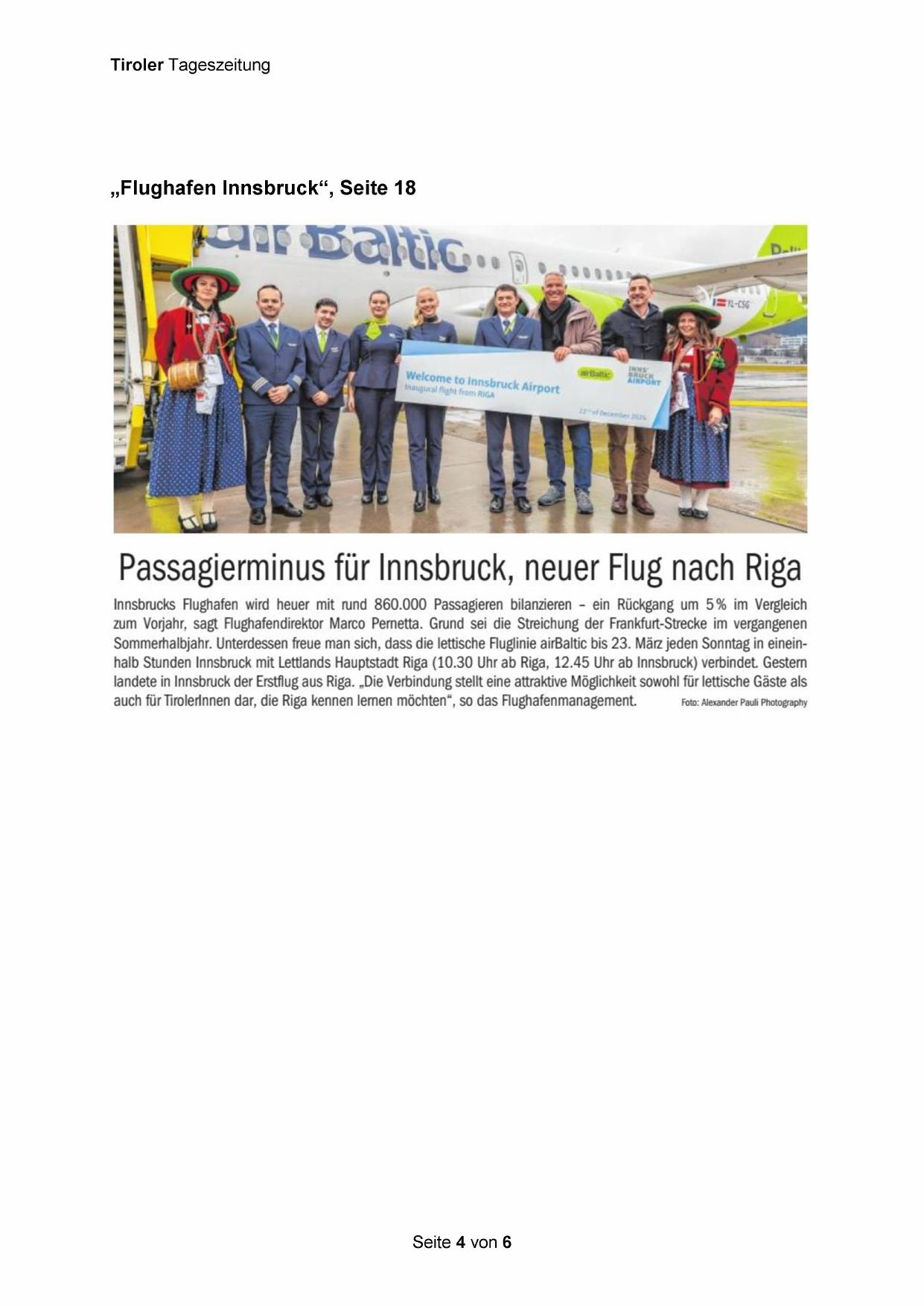 Sommerhalbjahr. Unterdessen freue man sich, dass die lettische Fluglinie airBaltic bis 23. März jeden Sonntag in eineinhalb Stunden Innsbruck mit Lettlands Hauptstadt Riga (10.30 Uhr ab Riga, 12.45 Uhr ab Innsbruck) verbindet. Gestern