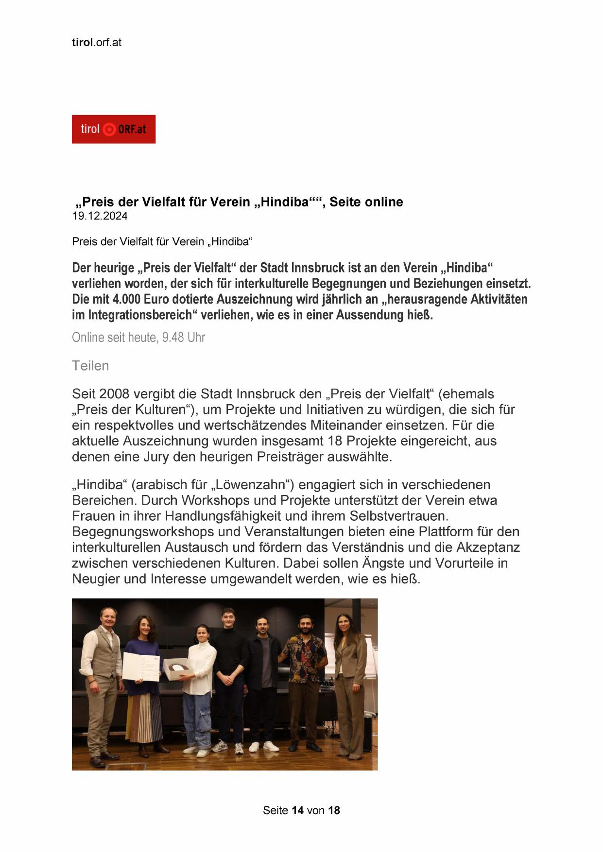 „Preis der Vielfalt für Verein „Hindiba““““, Seite online