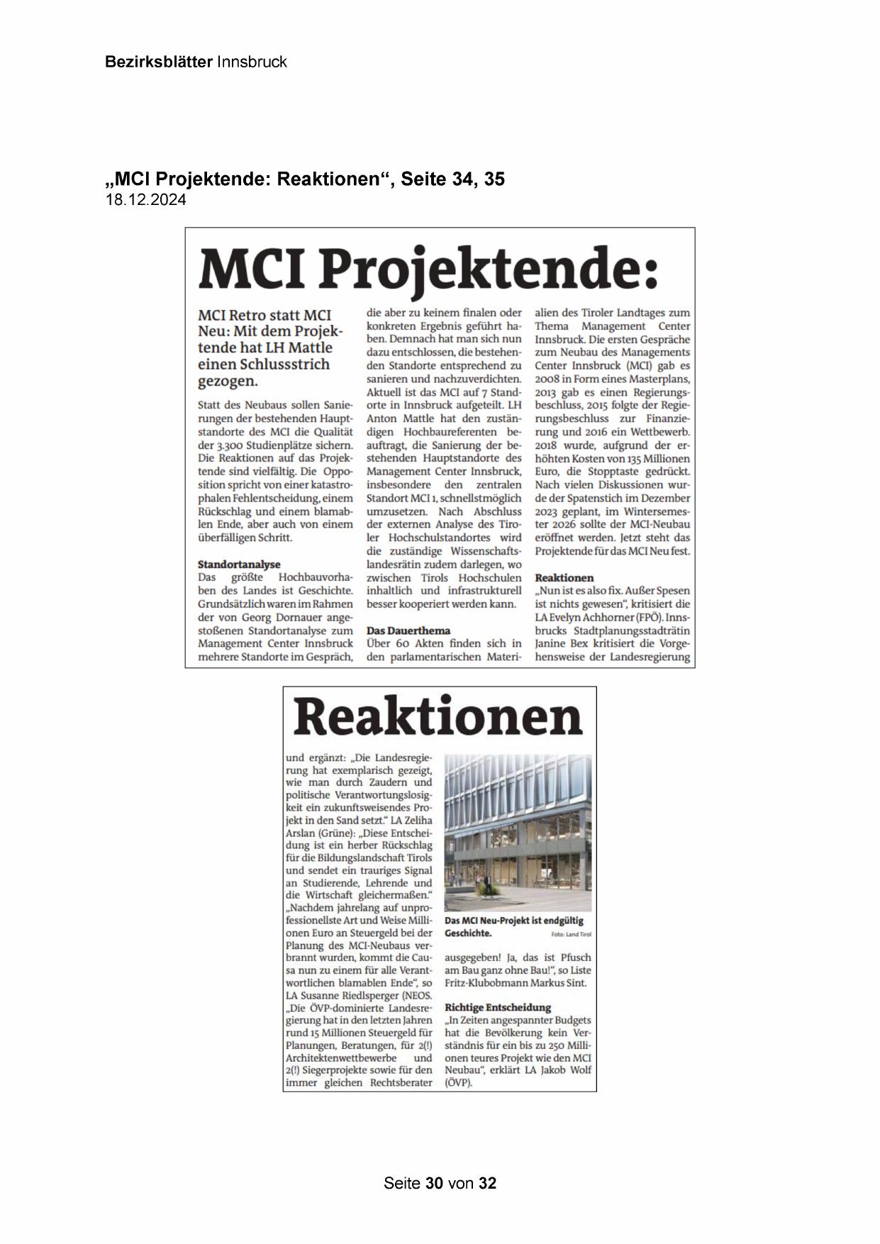 Planung des MCI-Neubaus verbrannt wurden, kommt die Causa nun zu einem für alle Verantwortlichen blamablen Ende“, so