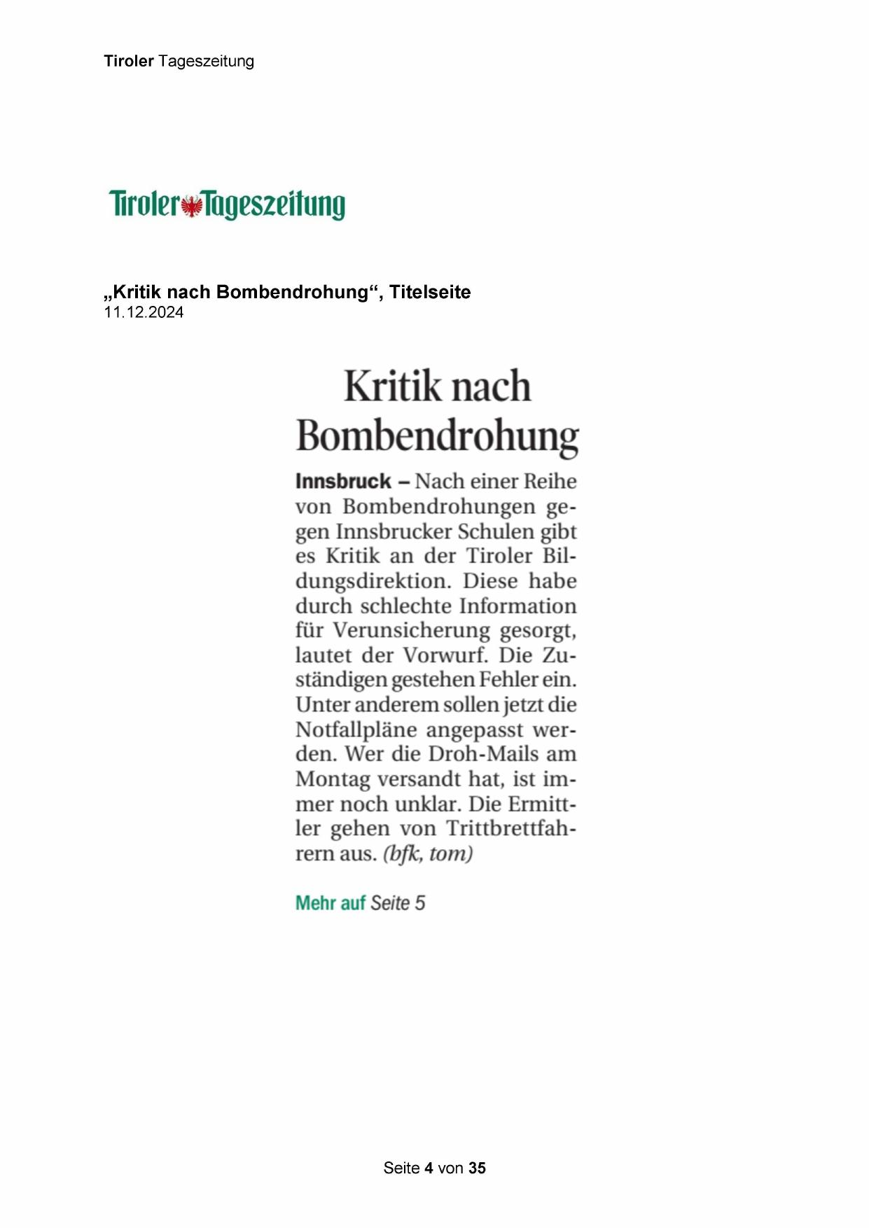 von Bombendrohungen gegen Innsbrucker Schulen gibt