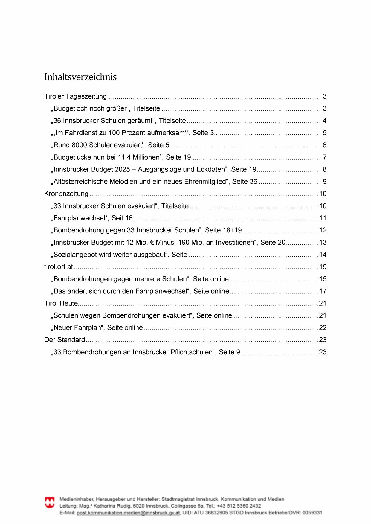 „Innsbrucker Budget mit 12 Mio. € Minus, 190 Mio. an Investitionen“, Seite 20................. 13