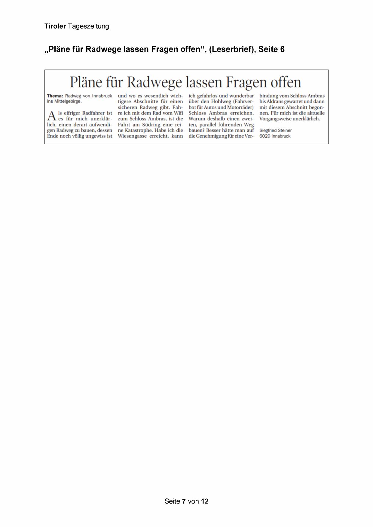 „Pläne für Radwege lassen Fragen offen“, (Leserbrief), Seite 6