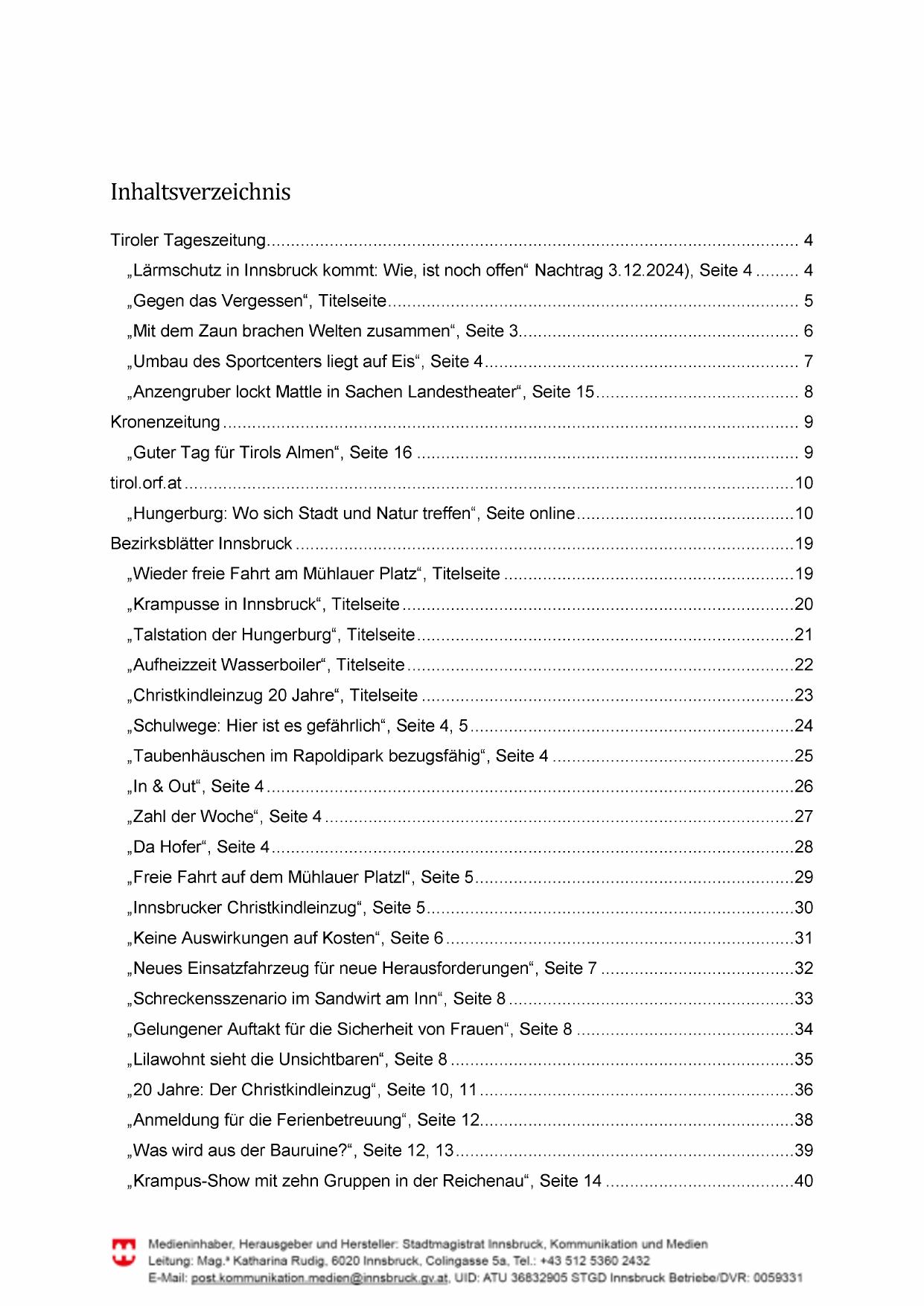 „Lärmschutz in Innsbruck kommt: Wie, ist noch offen“ Nachtrag 3.12.2024), Seite 4......... 4