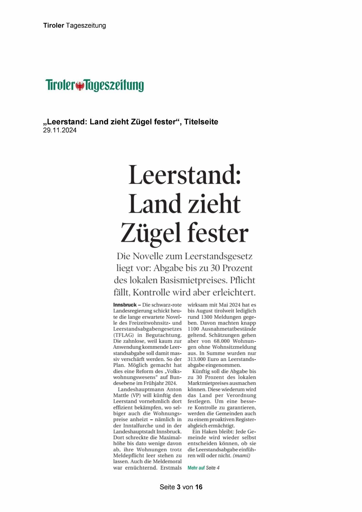 „Leerstand: Land zieht Zügel fester“, Titelseite
