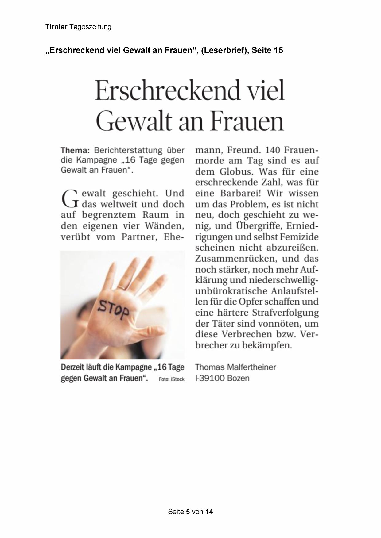 „Erschreckend viel Gewalt an Frauen“, (Leserbrief), Seite 15