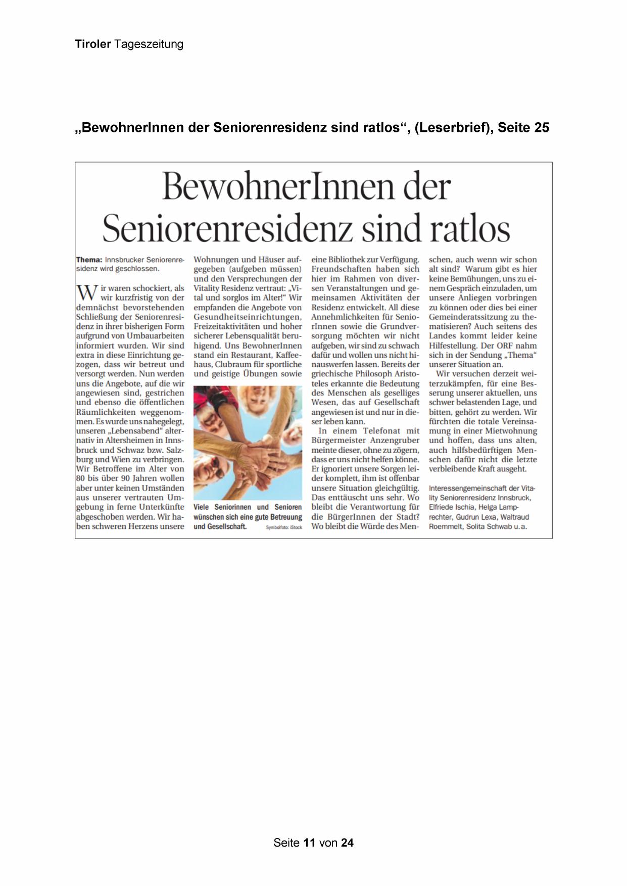 „BewohnerlInnen der Seniorenresidenz sind ratlos“, (Leserbrief), Seite 25