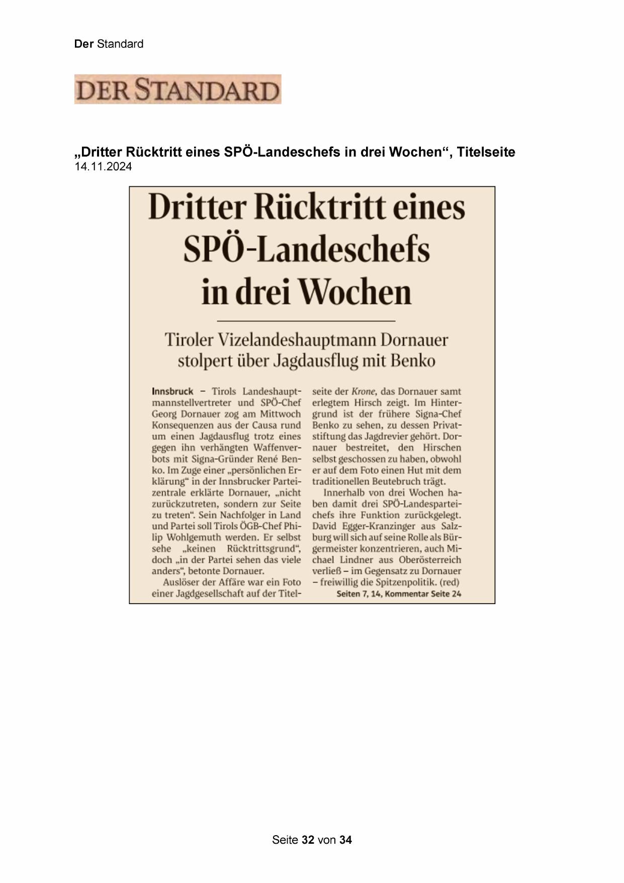gegen ihn verhängten Waffenverbots mit Signa-Gründer Rene Benko. Im Zuge einer „persönlichen Erklärung“ in der Innsbrucker Parteizentrale erklärte Dornauer, „nicht