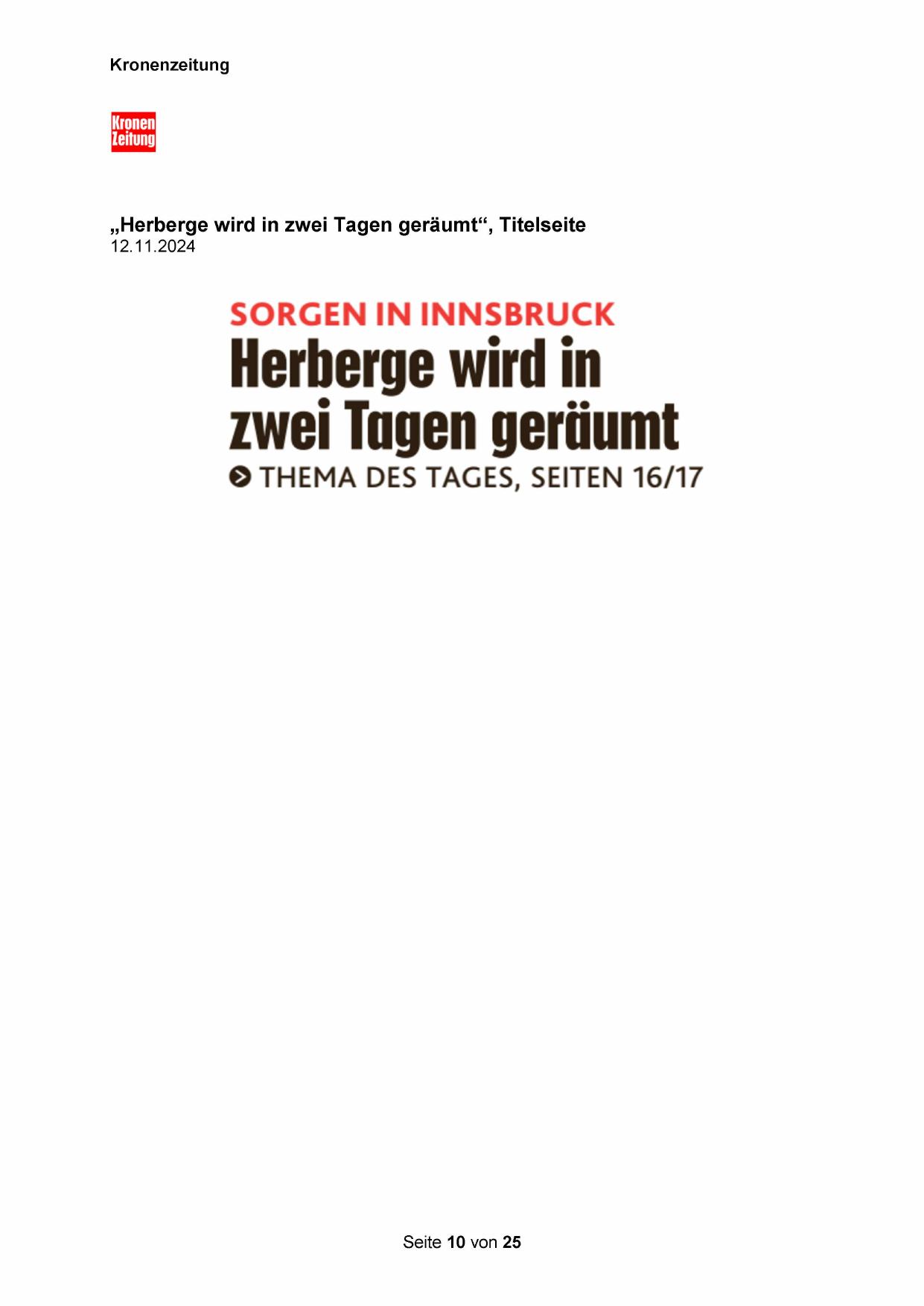 „Herberge wird in zwei Tagen geräumt“, Titelseite