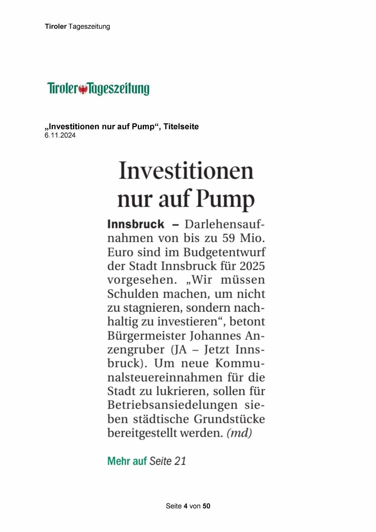 Bürgermeister Johannes Anzengruber (JA — Jetzt Innsbruck). Um neue Kommunalsteuereinnahmen für die