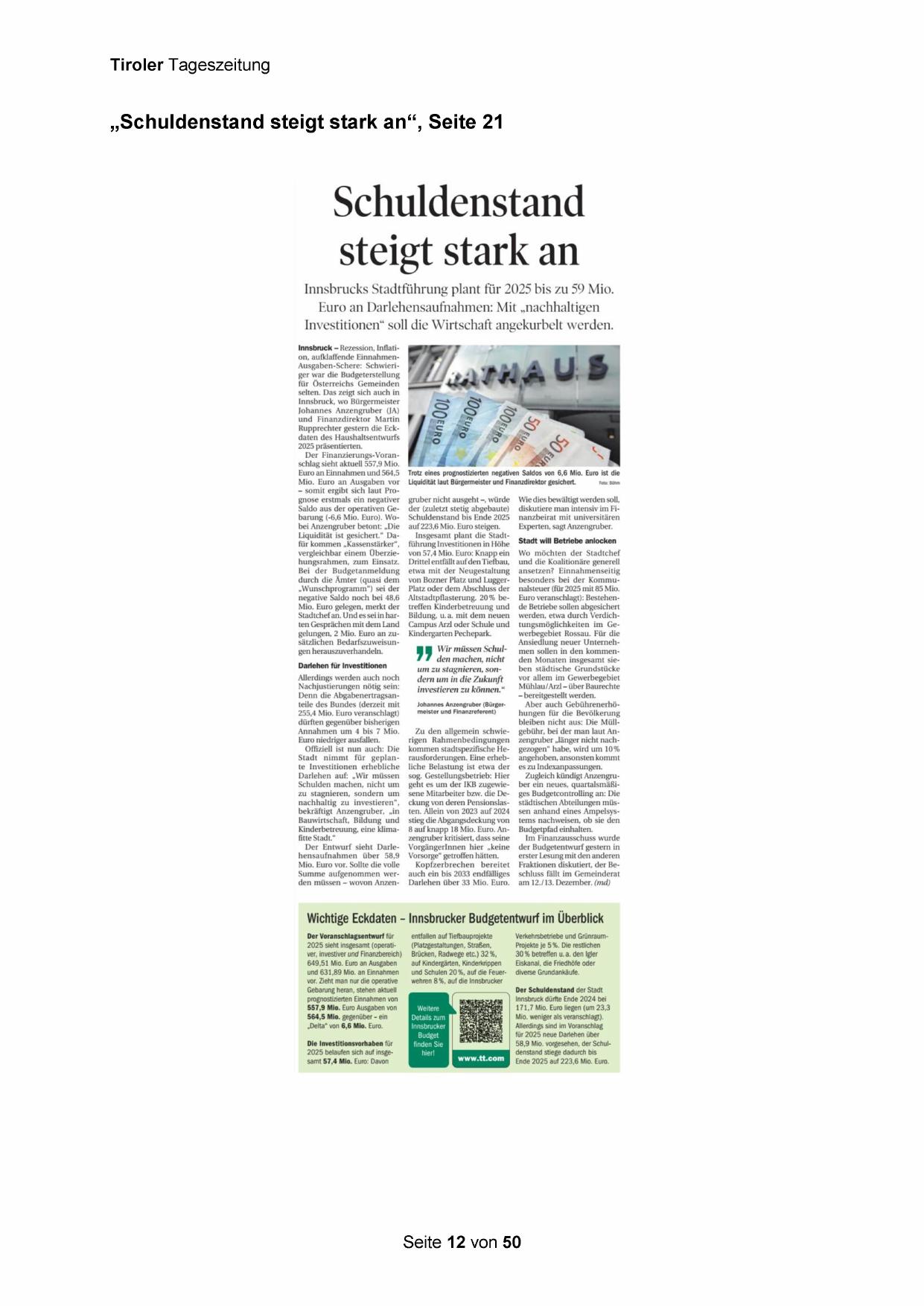 Innsbrucker Budgetentwurf im Überblick