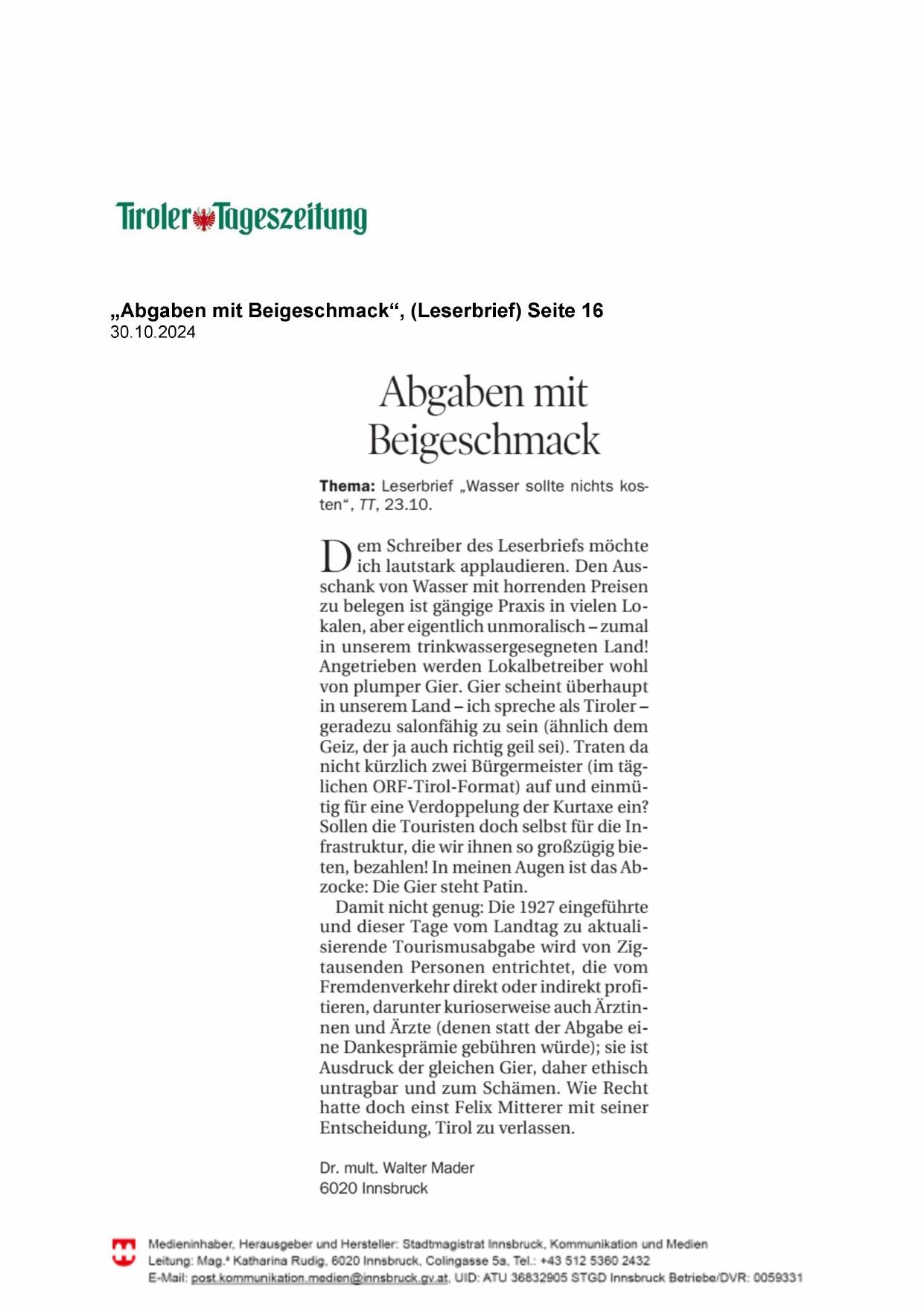 Thema: Leserbrief „Wasser sollte nichts kosten“, TT, 23.10.