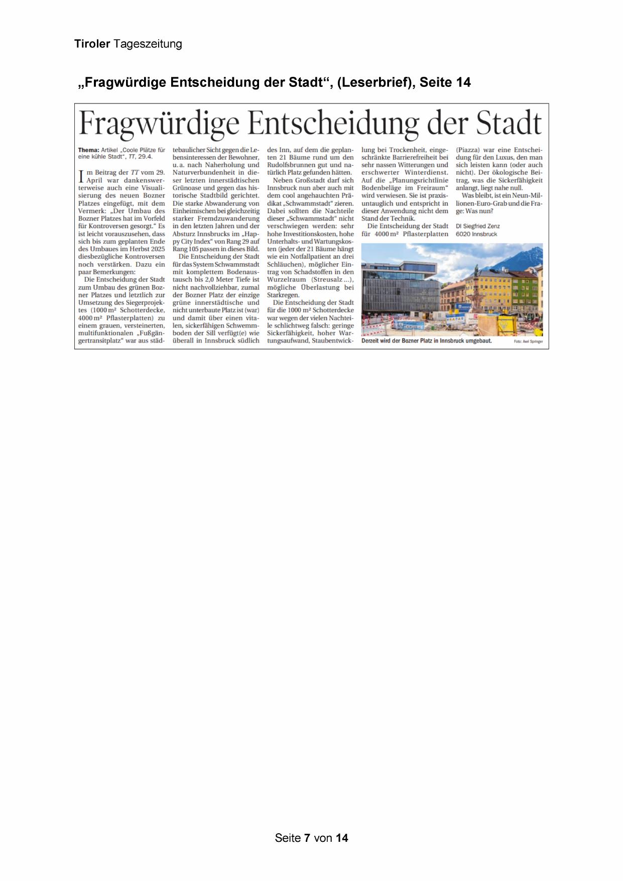 „Fragwürdige Entscheidung der Stadt“, (Leserbrief), Seite 14