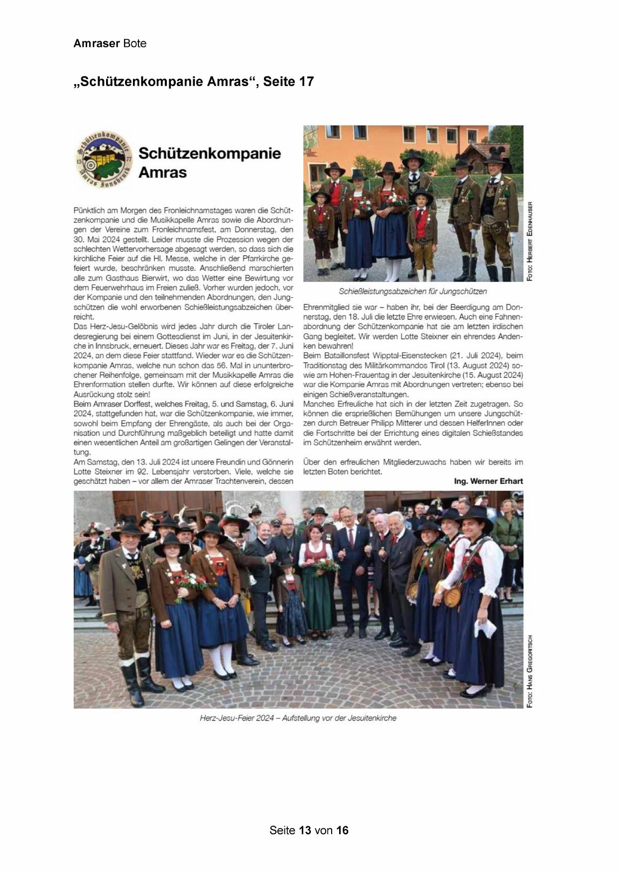 2024, an dem diese Feier stattfand. Wieder war es die Schützenkompanie Amras, welche nun schon das 56. Mal in ununterbrochener Reihenfolge, gemeinsam mit der Musikkapelle Amras die