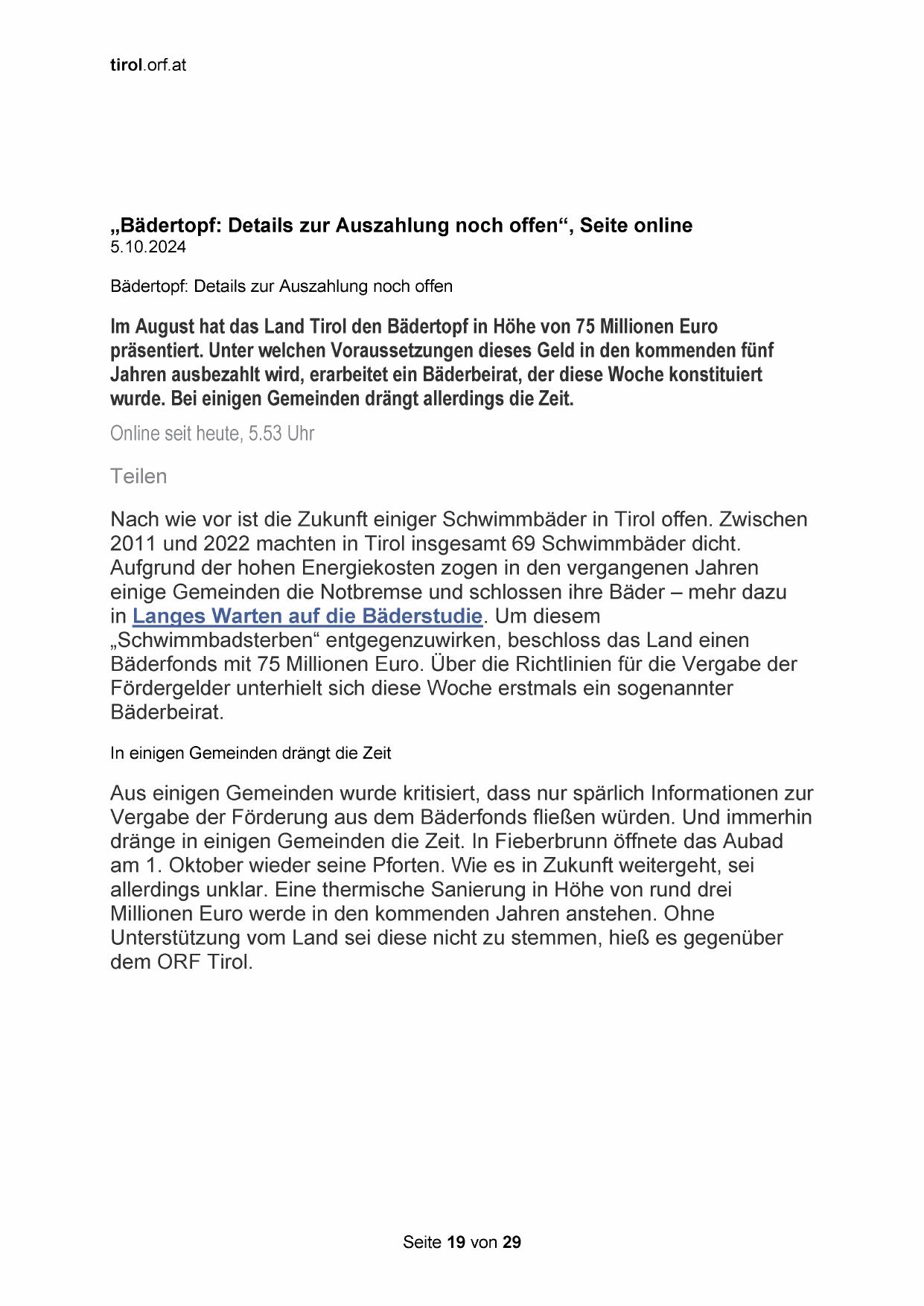 „Bädertopf: Details zur Auszahlung noch offen“, Seite online