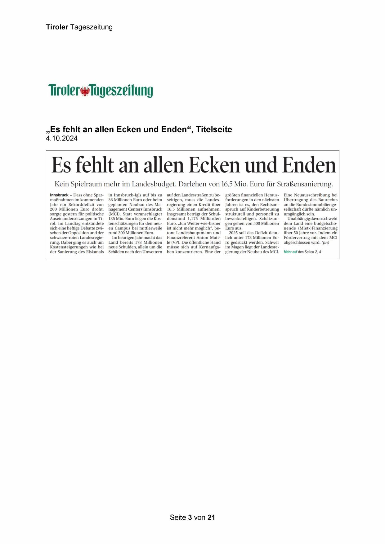 Innsbruck —- Dass ohne Sparmaßnahmen im kommenden