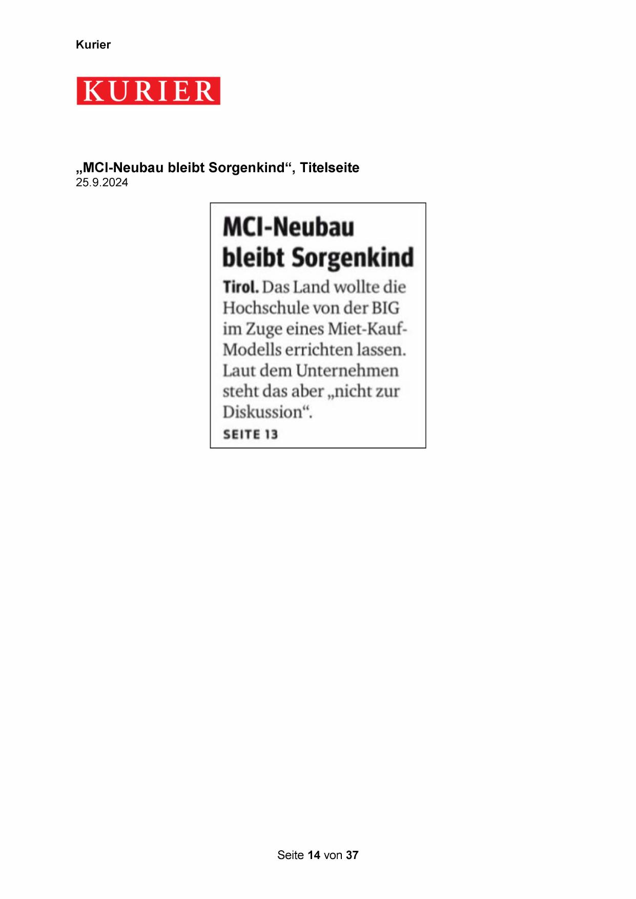 „MCI-Neubau bleibt Sorgenkind“, Titelseite