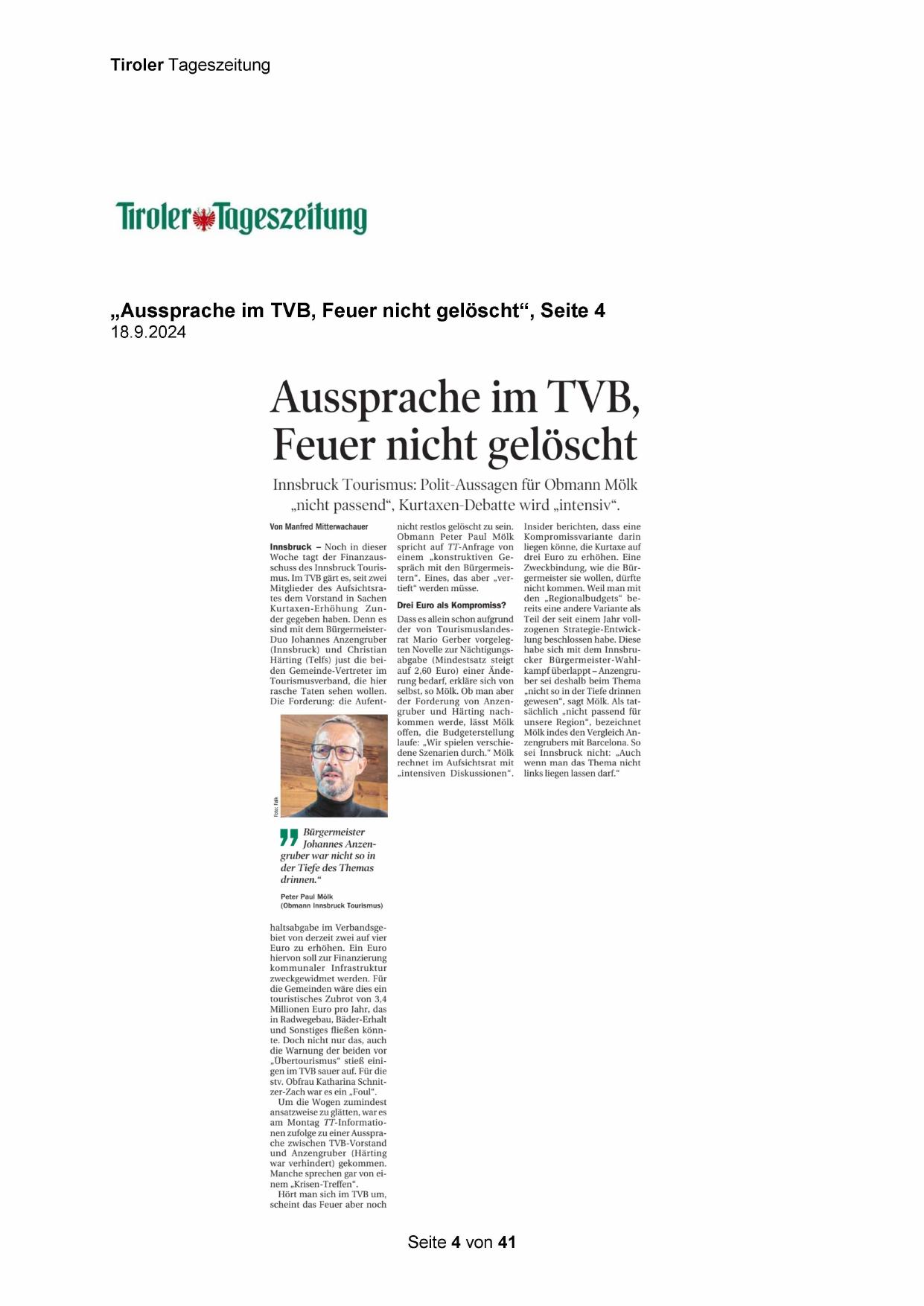 Innsbruck Tourismus: Polit-Aussagen für Obmann Mölk
