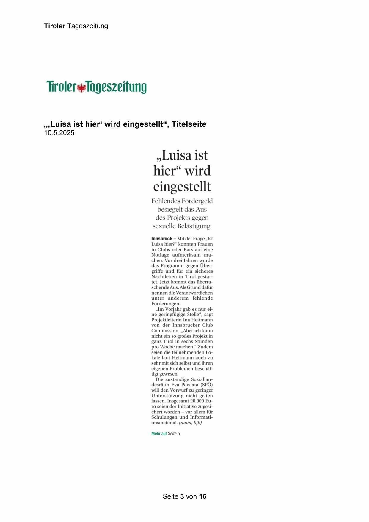 „‚Luisa ist hier‘ wird eingestellt‘“, Titelseite