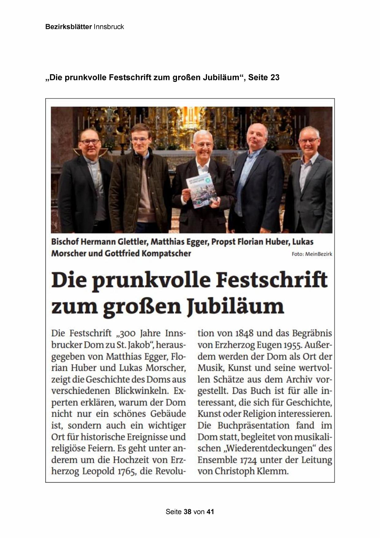 Die Festschrift „300 Jahre Innsbrucker Dom zu St. Jakob“ herausgegeben von Matthias Egger, Florian Huber und Lukas Morscher,