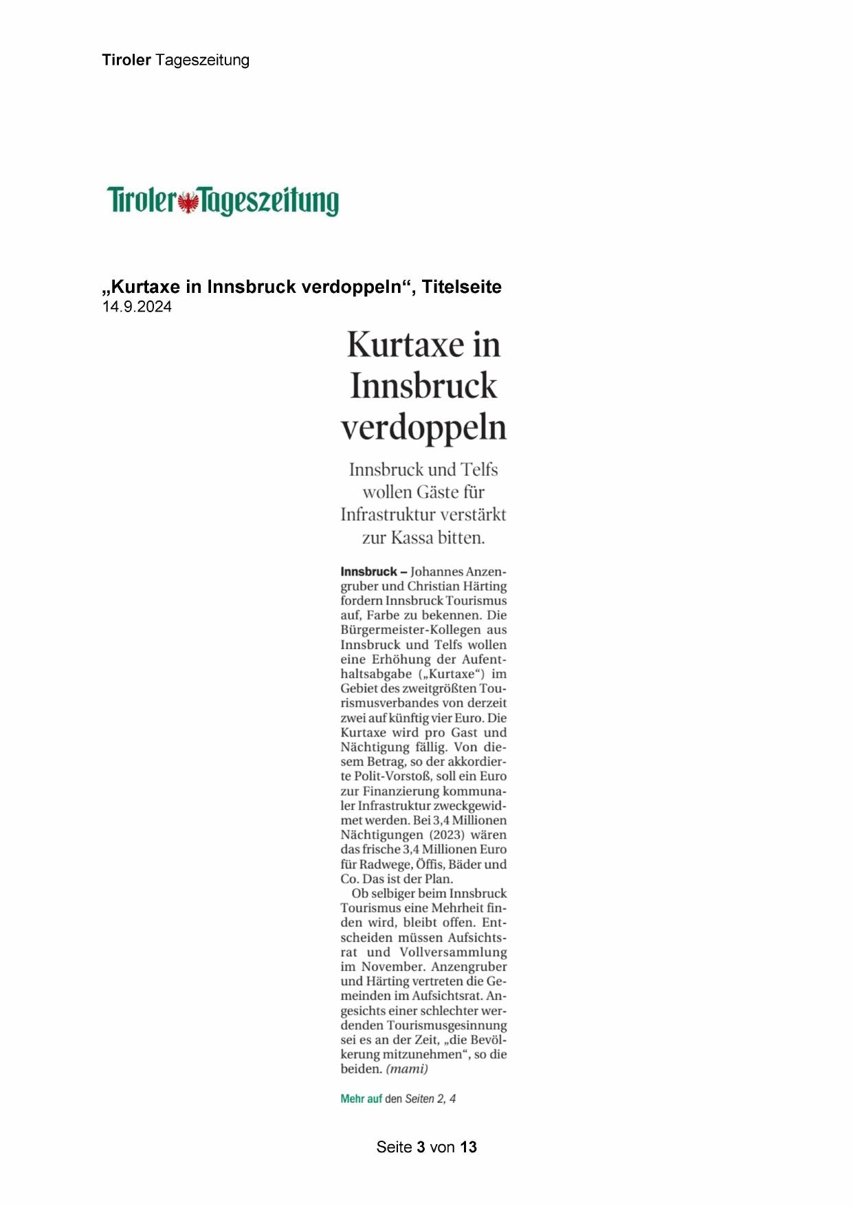 „Kurtaxe in Innsbruck verdoppeln“, Titelseite
