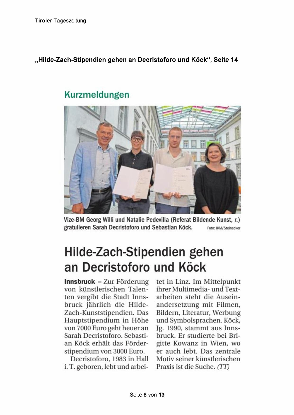 „Hilde-Zach-Stipendien gehen an Decristoforo und Köck“, Seite 14