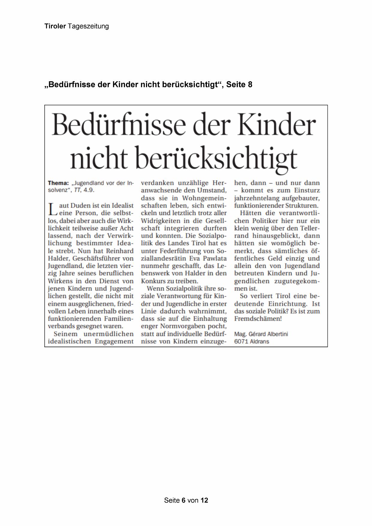 Thema: „Jugendliand vor der Insolvenz“, TT, 4.9.