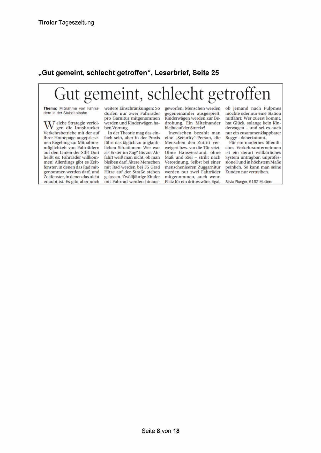 „Gut gemeint, schlecht getroffen“, Leserbrief, Seite 25