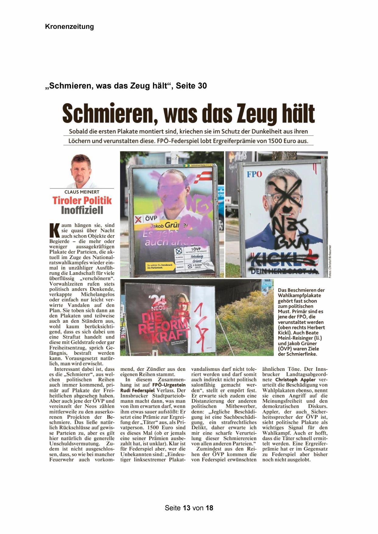 Löchern und verunstalten diese. FPÖ-Federspiel lobt Ergreiferprämie von 1500 Euro aus.