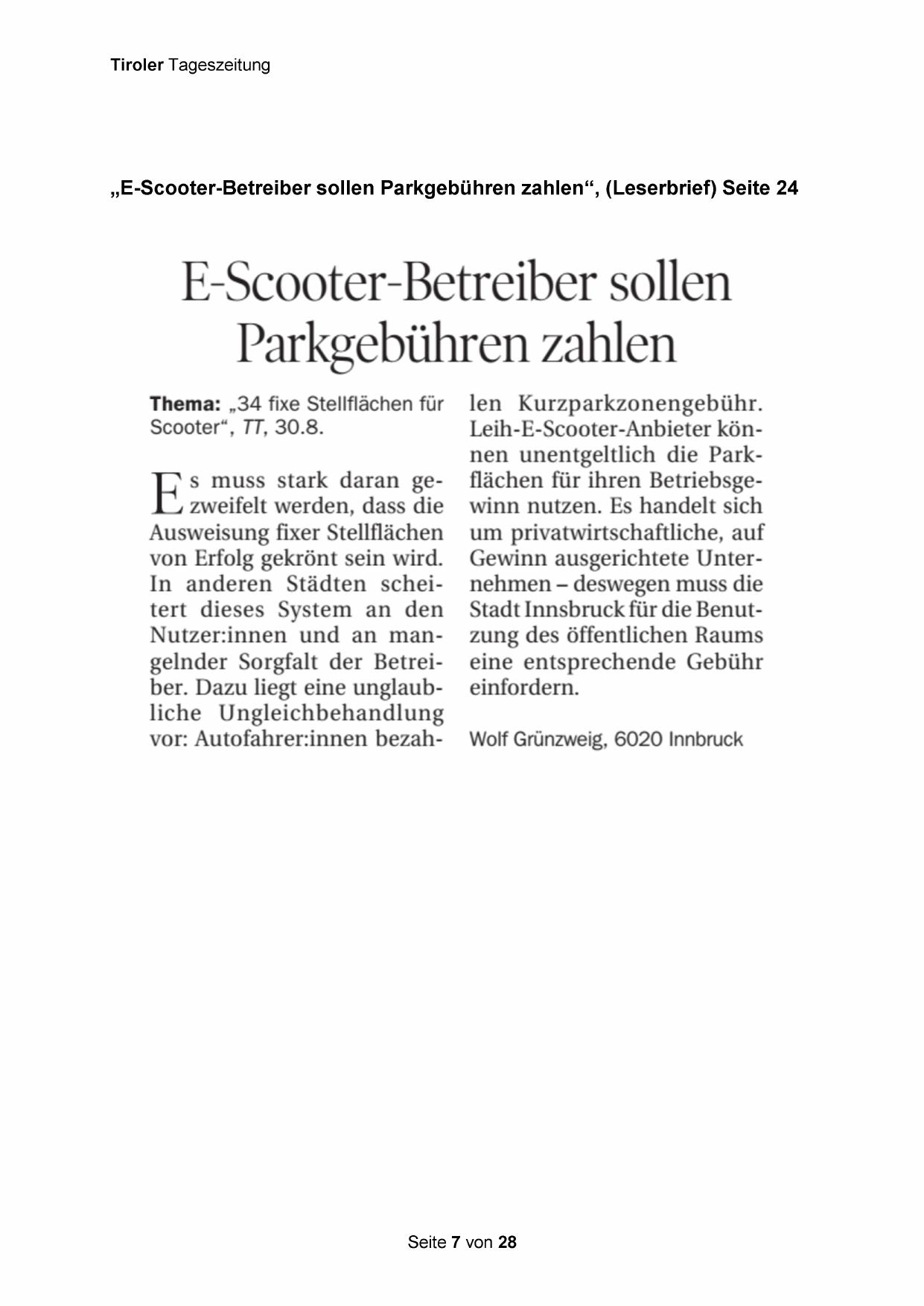 „E-Scooter-Betreiber sollen Parkgebühren zahlen“, (Leserbrief) Seite 24