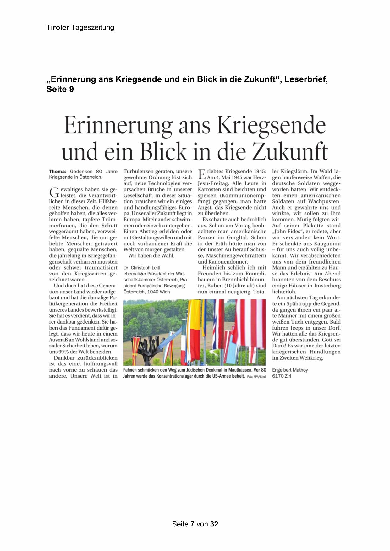 „Erinnerung ans Kriegsende und ein Blick in die Zukunft“, Leserbrief,