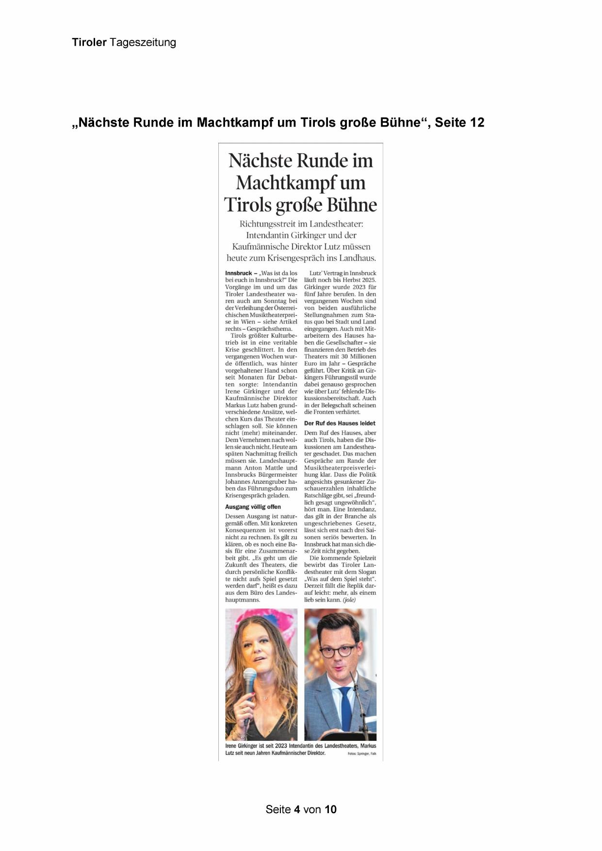 „Nächste Runde im Machtkampf um Tirols große Bühne“, Seite 12