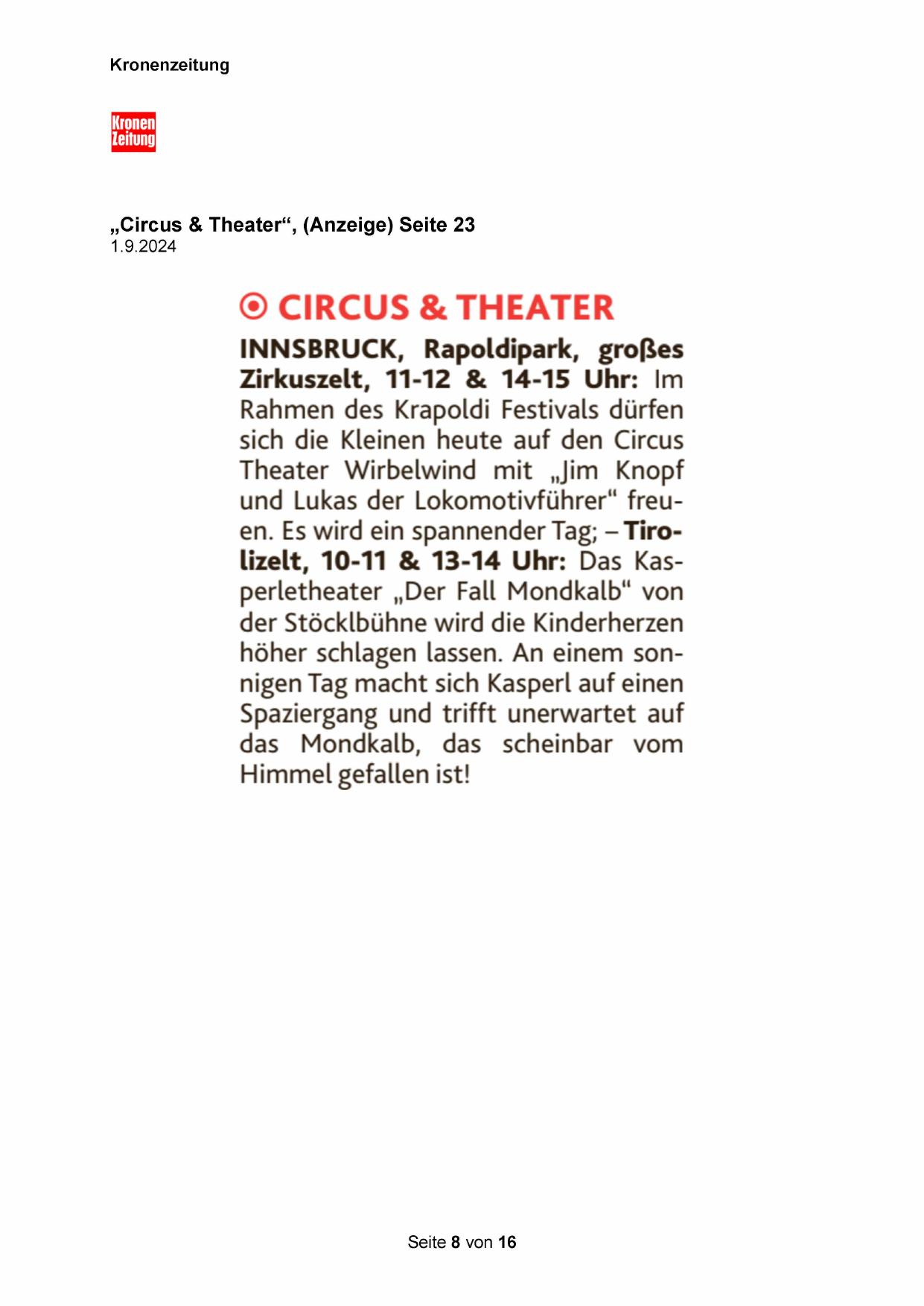 und Lukas der Lokomotivführer“ freuen. Es wird ein spannender Tag; - Tirolizelt, 10-11 & 13-14 Uhr: Das Kasperletheater „Der Fall Mondkalb“ von