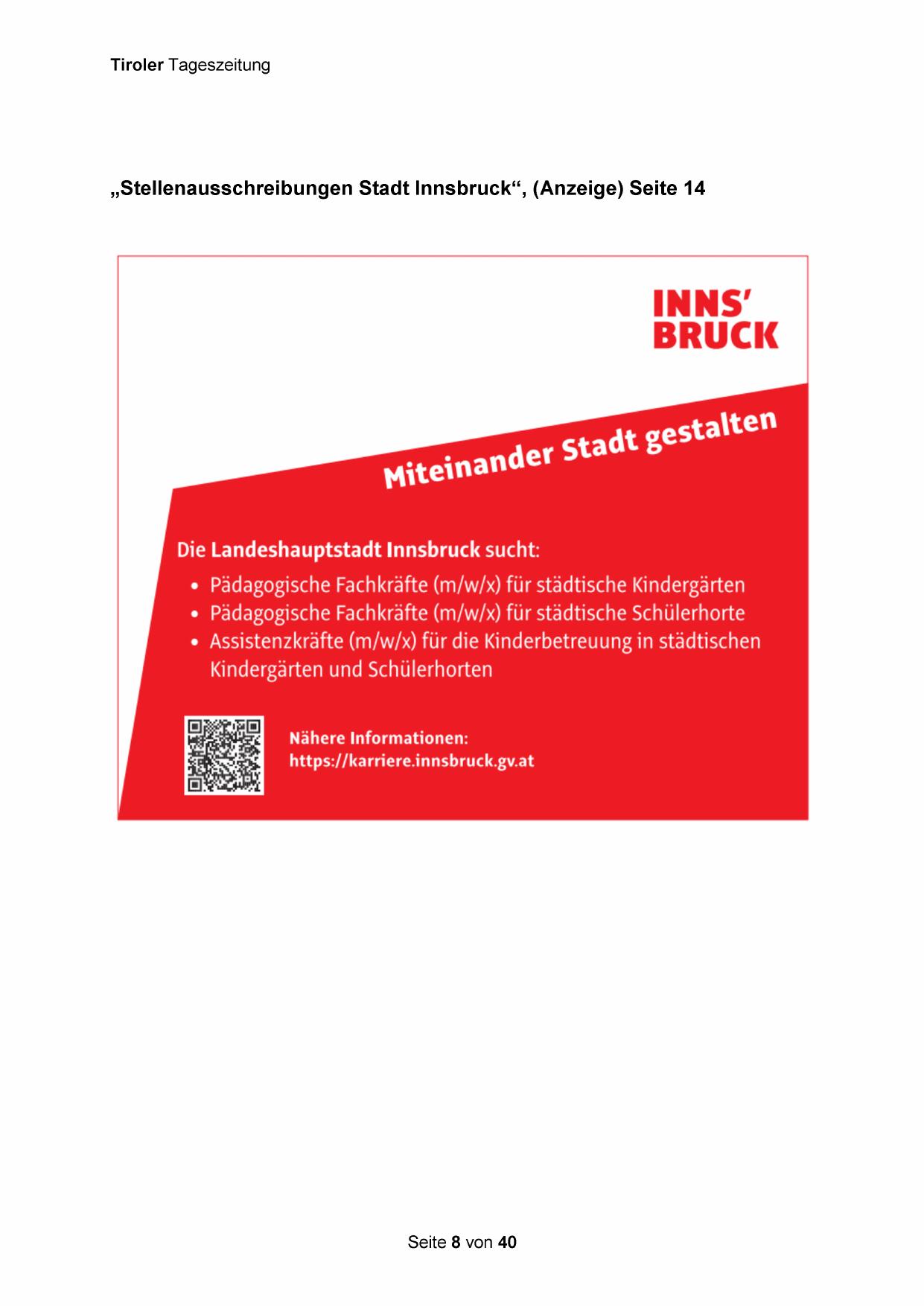 „Stellenausschreibungen Stadt Innsbruck“, (Anzeige) Seite 14