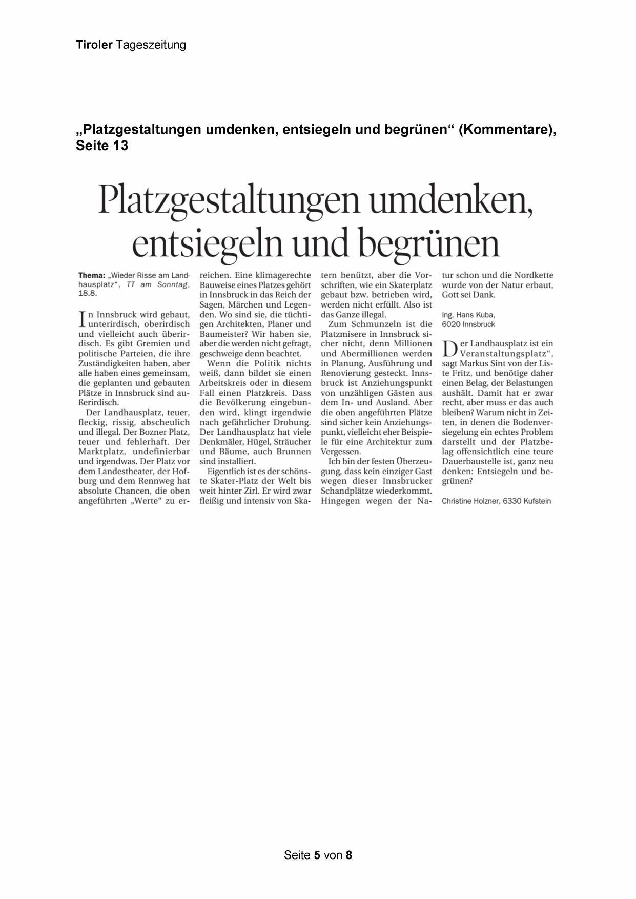 Thema: „Wieder Risse am Landhausplatz“, TT am Sonntag,